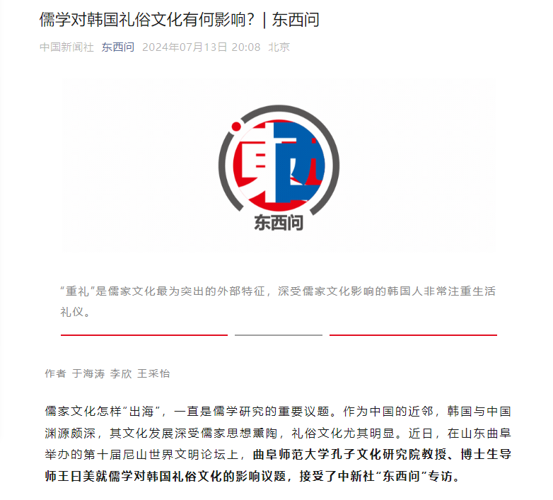 曲阜师大党委宣传部讯 近日,在山东曲阜举办的第十届尼山世界文明论坛上,中国新闻社“东西问”专访了D体育在线登录官网孔子文化研究院教授、博士生导师王曰美,并发布题为《儒学对韩国礼俗文化有何影响?》的新闻报道。