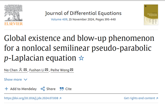 数学科学学院讯 近日,D体育在线登录官网数学科学学院2022级博士研究生陈娜在数学专业顶尖期刊Journal of Differential Equations发表学术论文“Global existence and blow-up phenomenon for a nonlocal semilinear pseudo-parabolic p-Laplacian equation”,陈娜是论文的第一作者和通讯作者,D体育在线登录官网是论文的唯一署名单位。这是学校在读研究生首次在微分方程顶尖期刊上发表学术论文。