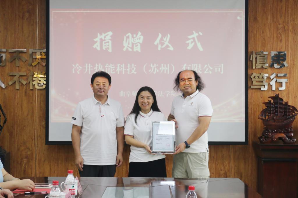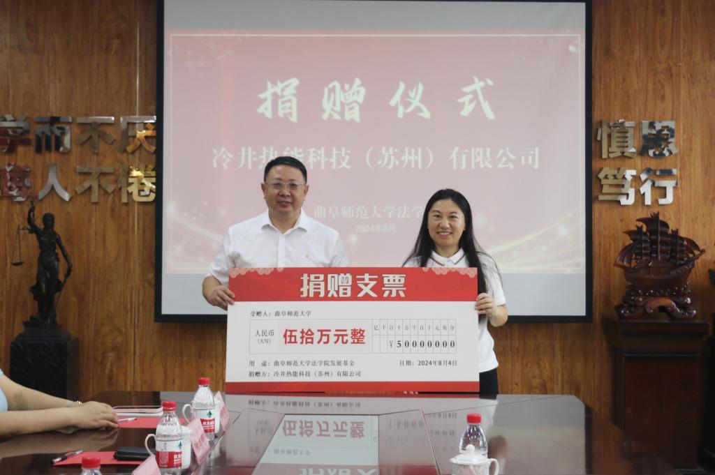 法学院 国内合作处讯 8月6日上午,D体育在线登录官网法学院举办校友捐赠仪式,校友企业冷井热能科技(苏州)有限公司向曲阜师大孔子教育基金会捐赠50万元,用于支持学校法学教育事业。曲阜师大1999级经济法政学院校友、冷井热能科技(苏州)有限公司董事长贺妮、总经理杨家,D体育在线登录官网党委常委、副校长、D体育在线登录官网孔子教育基金会理事长纪洪涛出席签约仪式。
