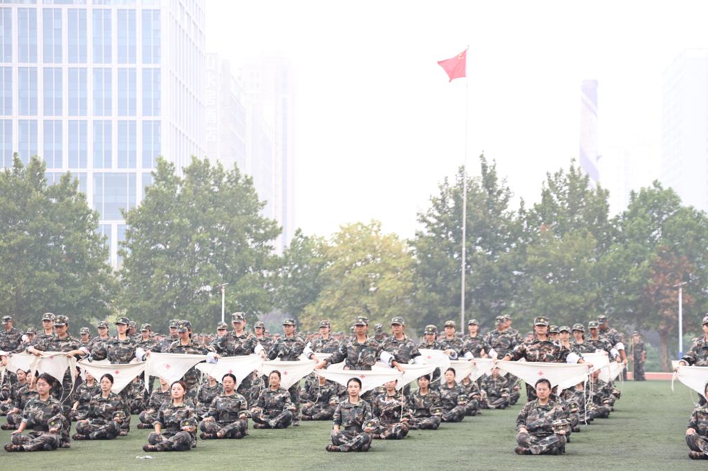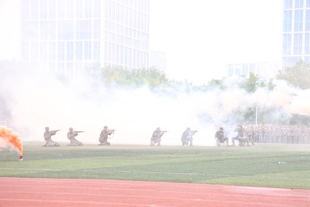参训新生精彩的汇报表演燃爆全场。标兵方阵、齐步跑步方阵、捕俘拳/擒敌拳方阵、内务战备方阵、旗语方阵、应急棍术方阵、捕俘刀/匕首操方阵、心理健康操方阵、剑术方阵、战地急救方阵、战术方阵分别亮相。1600人组成的标兵方阵用手中红白双色卡,摆出“1921”“开天辟地”“河山统一”“改革开放”“2024”“75”等字样和井冈山、天安门、复兴号等图案,令人震撼。由女生组成的齐步方阵和男生组成的跑步方阵共同表演了队列动作,在教官的口令下,他们目光如炬,铿锵有力的脚步声响彻全场,一步一踏是他们对胜利的坚定信念。捕俘拳和擒敌拳方阵,一招一式,拳拳生风。内务战备方阵,汇报了从休息到起床,然后迅速着装、整理内务和背包、准备行军的全过程,他们动作敏捷、一丝不苟,整装待发、训练有素,他们未雨绸缪、蕴势以待,厉兵秣马、藏器于身。旗语方阵手持双色旗帜迅速入场,旗是他们的武器、语是他们的指令,一起一落、一挥一舞,准确传递指令。应急棍术方阵的长棍在他们手中化身长剑,直指苍穹,洪亮的口号回荡在整个训练场地。捕俘刀、匕首操方队手握短刀,一刀一式,一出一收,干脆利落,深刻诠释巾帼不让须眉。心理健康操方阵舞姿轻快活泼,微风将活力的音符吹到每个人耳边,快乐和激情填满场地每个角落。剑术方阵挥剑如流星划破夜空,技巧娴熟,剑威猛厉,迅捷精准。战地急救方阵行动专业、动作娴熟,止血、包扎、急救,救死扶伤,及时到位。军训教官和军训新生带来的战术表演,将汇演推向高潮。作为道具和背景的阵阵浓烟和枪炮声缭绕操场,机智的战术、激烈的格斗、迅速的伤员救护、密切的配合与相互掩护,引来观众阵阵掌声和喝彩。汇演最后,胜利的红旗久久挥舞,现场气氛热烈,掌声欢呼声不断,全体新生的爱国情怀持续激荡。线上曲园学工微信号同步直播,1.8万人在线观看,点赞超过10万、好评如潮。
