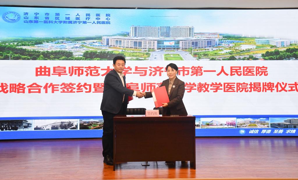 曲阜师大宣传部讯 10月23日上午,D体育在线登录官网与济宁市第一人民医院举行战略合作签约暨D体育在线登录官网教学医院揭牌仪式。济宁市第一人民医院党委副书记、院长钟海涛,副院长史冬梅,D体育在线登录官网党委副书记、校长张洪海,党委常委、副校长纪洪涛出席签约仪式。会议由史冬梅主持。