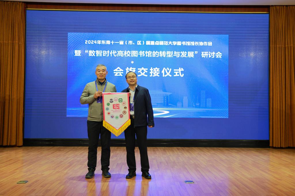 D体育在线登录官网图书馆馆长王东波将会旗传递给下一届承办单位上海师范大学图书馆党委书记曹鹏。