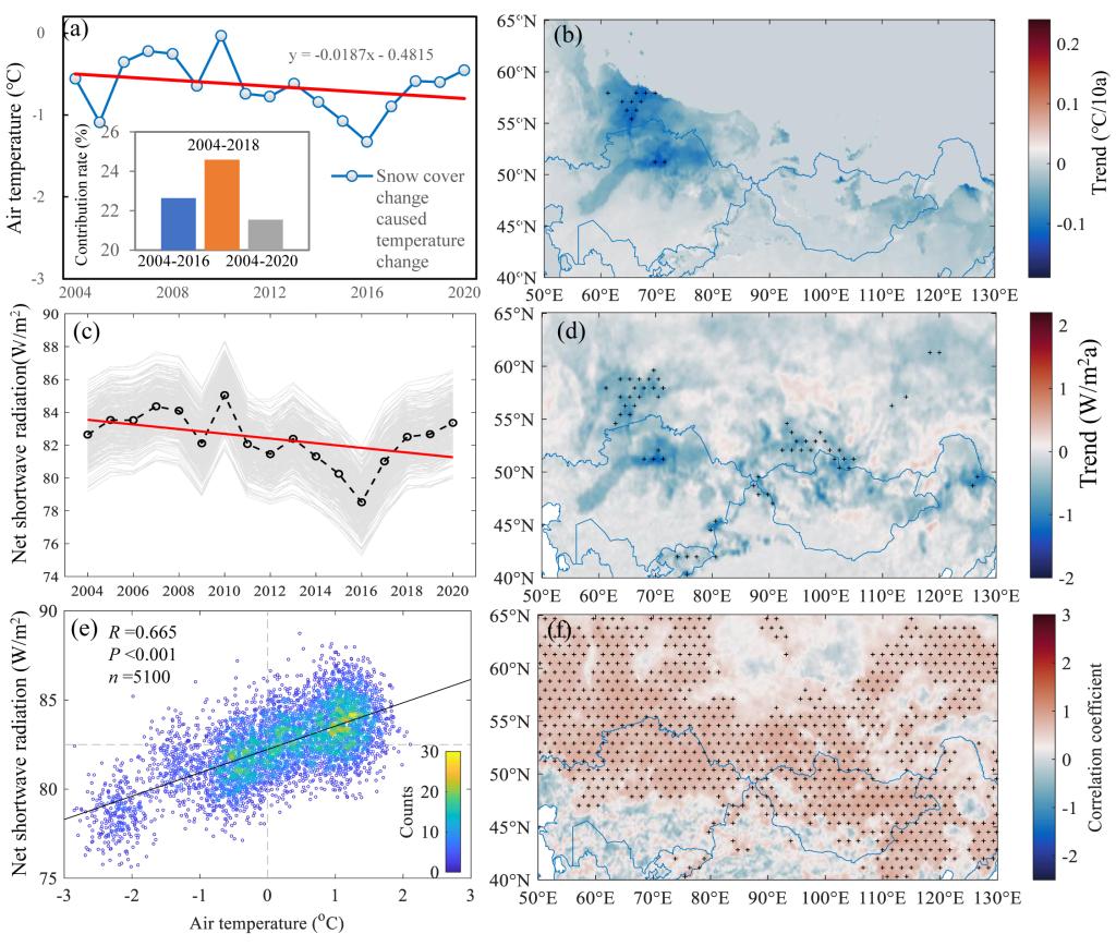 图2 2004-2020年亚欧大陆秋季积雪引起的气温变化及其与积雪引起的净短波辐射变化的关系