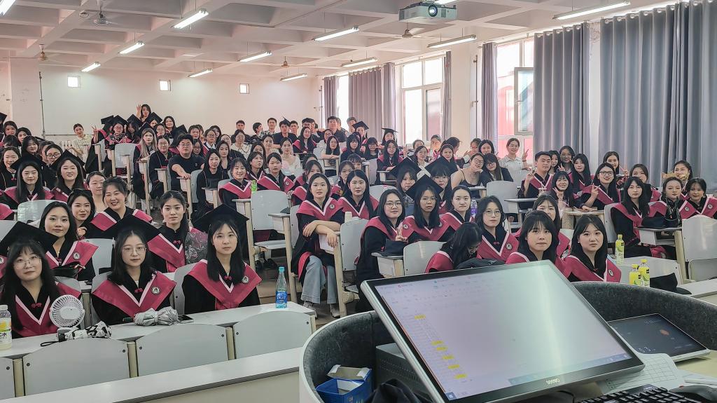 “陈姿彤”“到!”“张相科”“到!”……在马克思主义学院为2025届毕业生准备的“明德弘道·知行合一”主题思政课上,当同学们身着学位服坐满教室,辅导员张林以最后一次课上点名的“开场白”戳中了大家的泪点。随着熟悉的名字被逐一念起,每位同学起立高声答“到”,教室里瞬间被温情与不舍填满。