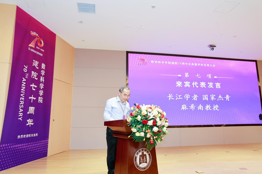 来宾代表麻希南教授在致辞中回顾了多次到访学院的经历,高度称赞学院的人才培养质量,其身边的曲园数学校友普遍学风朴实、基础扎实、热爱专业。他充分肯定学院培养出包括中国科学院院士在内的大批优秀人才,期望学院以七十周年院庆为新起点,坚持高质量科研,聚焦省属高校拔尖人才培养,通过内涵式发展赢得社会声誉,为教育强国建设贡献力量。
