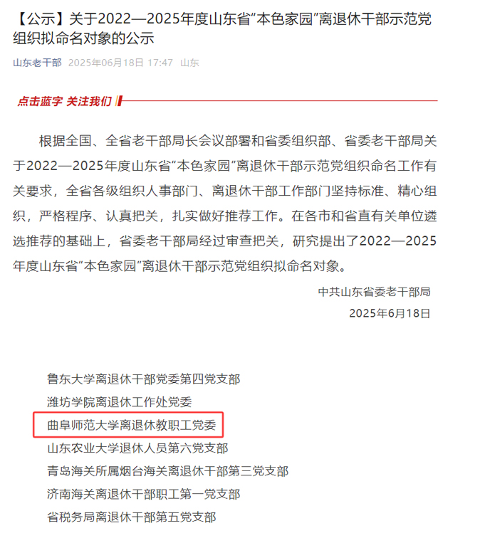 离退休工作处 近日,中共山东省委老干部局发布公示,D体育在线登录官网离退休教职工党委荣获2022—2025年度山东省“本色家园”离退休干部示范党组织称号。