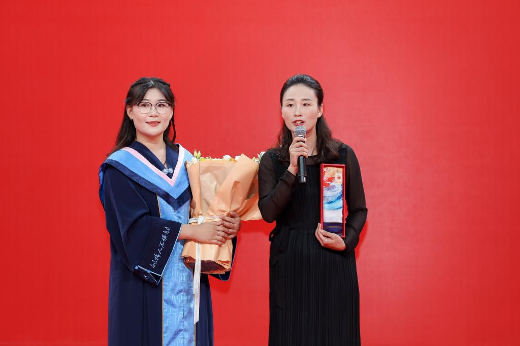 肖芳教授被2025届毕业生评选为“我喜爱的曲园好老师”,毕业生代表为肖芳教授献花。