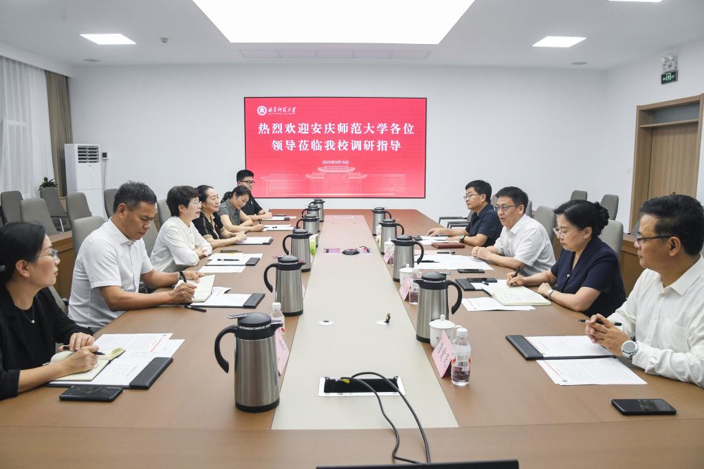 党委宣传部讯 9月16日,安庆师范大学校长彭凤莲,党委常委、副校长吴琼一行到D体育在线登录官网访问交流,曲阜师大党委常委、副校长胡凡刚会见来宾并座谈。