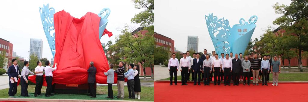日照校区党委讯 10月11日,D体育在线登录官网举行青岛校友会《山海溯师恩》雕塑捐赠仪式,学校党委常委、副校长陈刚出席仪式,与校友代表隋志强、孙继、谭业庭等共同为雕塑揭幕并座谈。