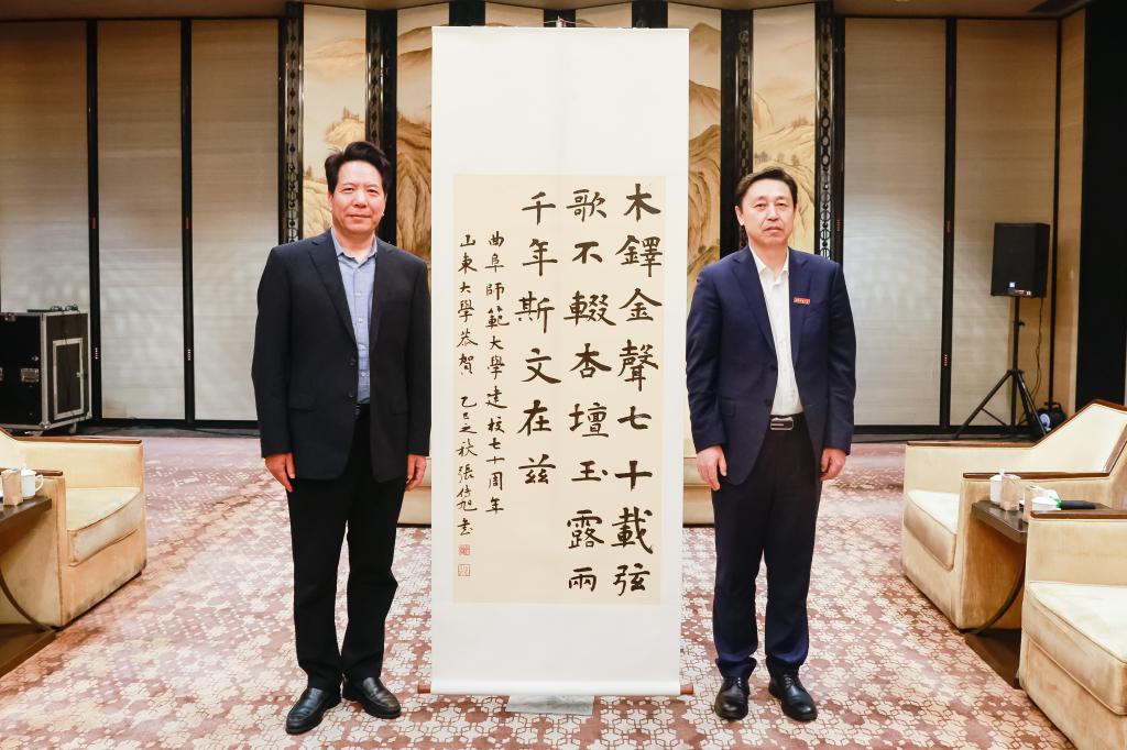 曹现强代表山东大学向曲阜师大赠送书法作品,对曲阜师大迎来建校70周年表示热烈祝贺,高度评价了曲阜师大的办学成就和特色优势,祝愿曲阜师大弦歌更盛、再谱华章。曹现强表示,曲阜师大与山东大学之间积淀了深厚情谊,取得了一系列合作硕果,希望两校不断谱写合作共赢新篇章,携手答好服务高质量发展的时代课题。