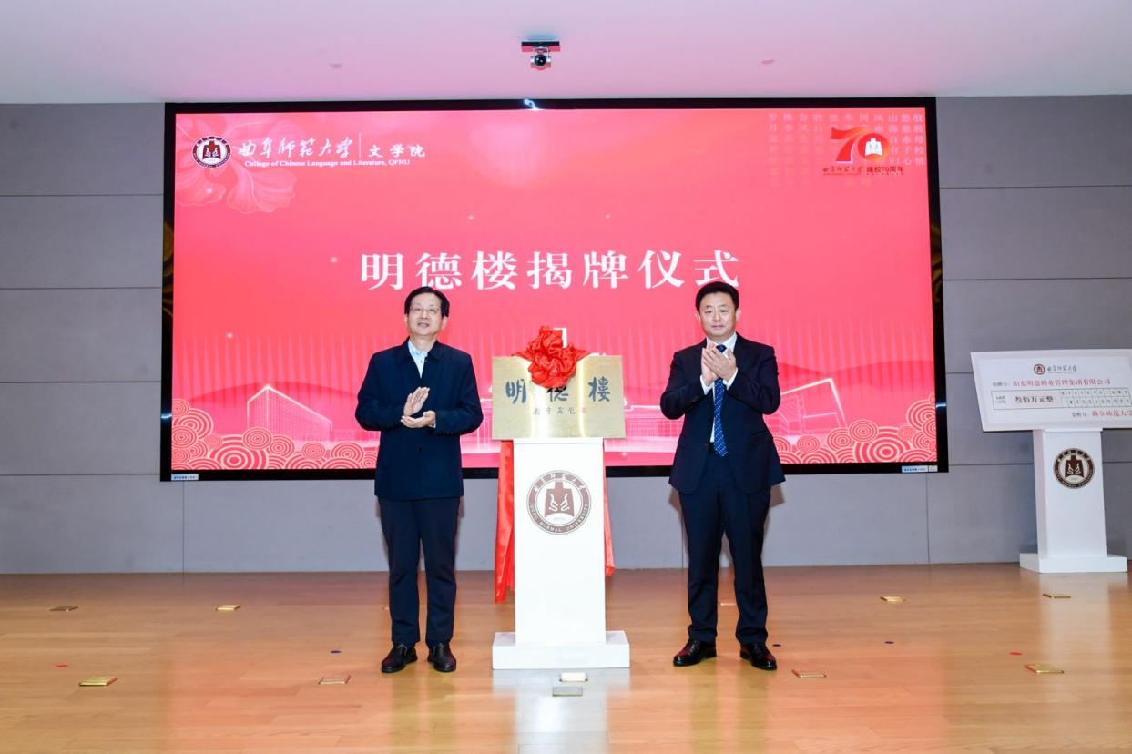 会议还进行了文学院“明德楼”揭牌仪式,孙继业、纪洪涛共同为其揭牌。“明德楼”由著名书法家刘守安题写,取自“大学之道,在明明德”之意。