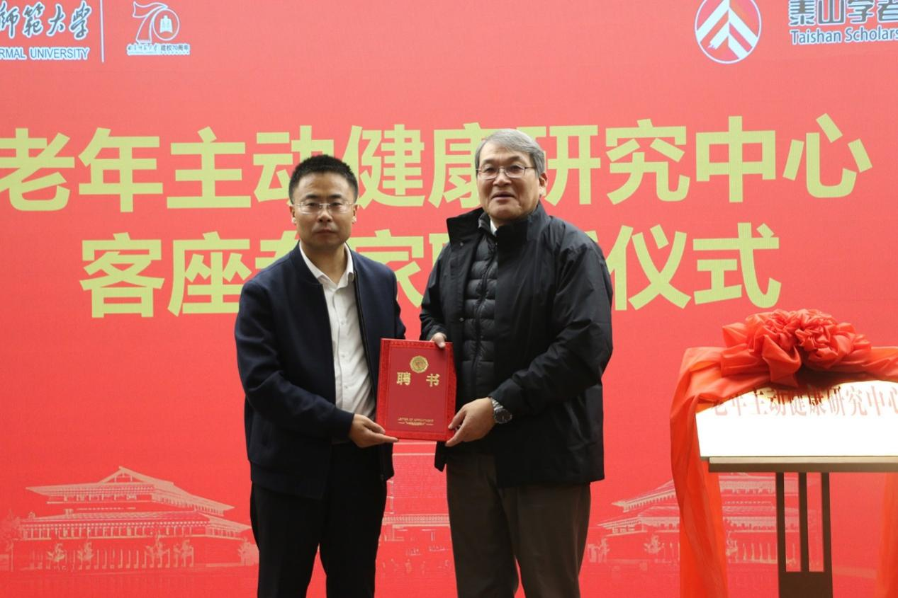 李登旺与陈佩杰共同为"D体育在线登录官网老年主动健康研究中心"揭牌,李登旺为与会专家颁发客座教授聘书。