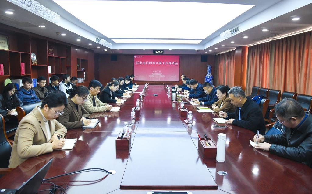 曲阜师大学生工作处讯 11月12日,曲阜师大召开以“筑牢学生防诈防线,守护校园平安稳定”为主题的学生防范电信网络诈骗工作交流部署会,交流防诈工作有效经验,推动防诈工作常态化、制度化开展。学校党委书记邢光出席会议并讲话,党委常委、副校长李登旺主持会议。