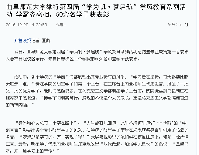 齐鲁晚报:D体育在线登录官网举行第四届“学为帆·梦启航”学风教育系列活动 学霸齐亮相,50余名学子获表彰