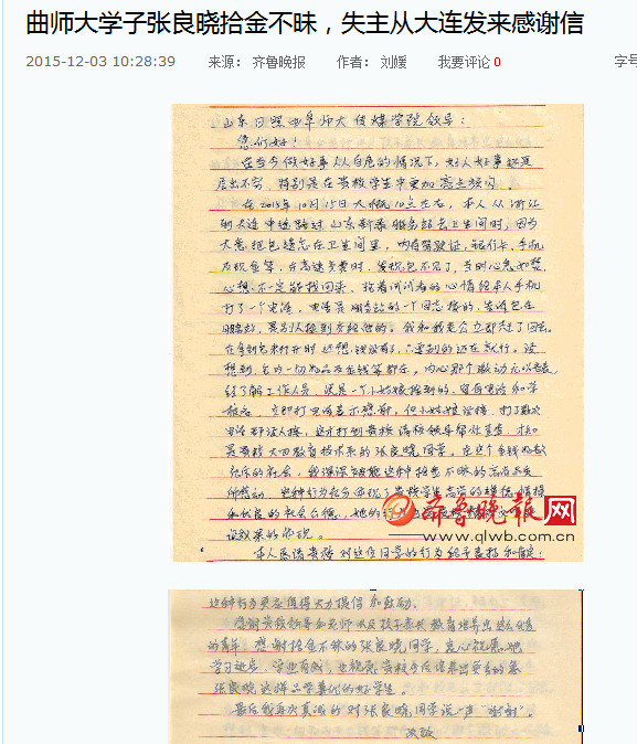 齐鲁晚报:曲师大传媒学院学子张良晓拾金不昧,失主从大连发来感谢信