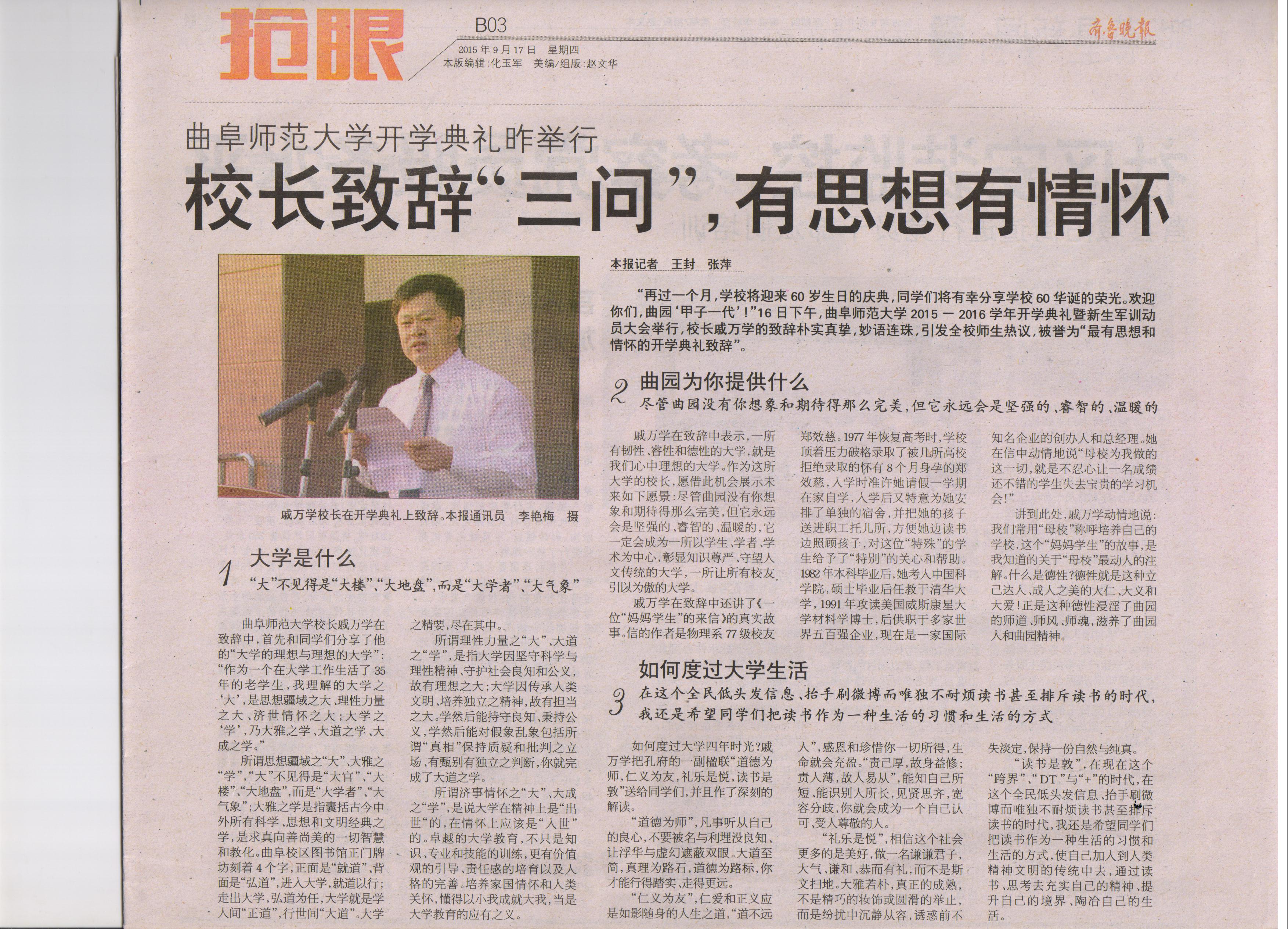 齐鲁晚报:D体育在线登录官网开学典礼,戚万学校长致辞“三问”,有思想有情怀