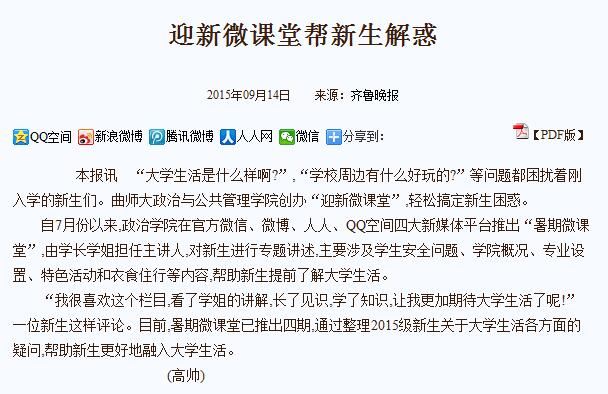 齐鲁晚报:迎新报道 政治学院迎新微课堂帮新生解惑