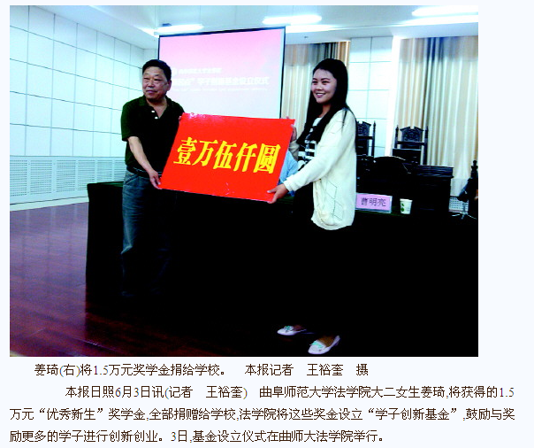 齐鲁晚报:大二女生1.5万奖学金捐学校