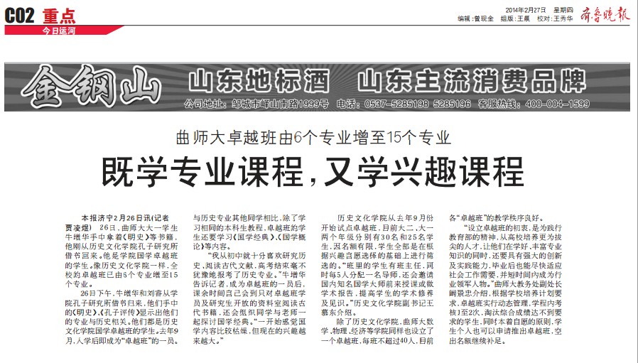 齐鲁晚报:曲师大卓越班由6个专业增至15个专业