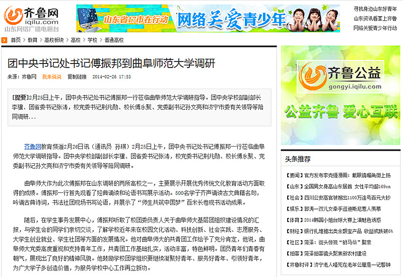 齐鲁网:团中央书记处书记傅振邦到D体育在线登录官网调研