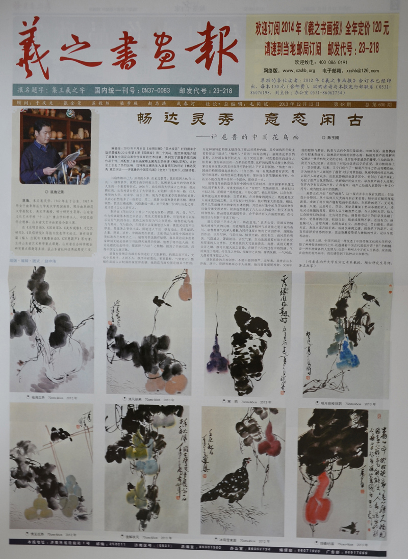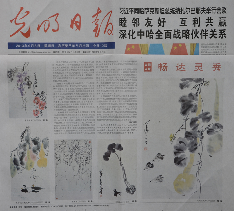 2013年9月8日《光明日报》“美术视界”版用半个整版的篇幅、2013年第5期《国画家》用三个页码、2013年12月13日《羲之书画报》头版一个整版的篇幅,图文并茂地介绍了我校副校长扈庆学教授(笔名扈鲁)在中国花鸟画创作领域的艺术成就。共刊发扈鲁的花鸟画作品18件,并配发了著名画家陈玉圃先生的画评《畅达灵秀》。作品刊发后,在社会上引起了热烈反响,展示了我校教师在绘画领域取得的丰硕成果,为学校赢得了荣誉。