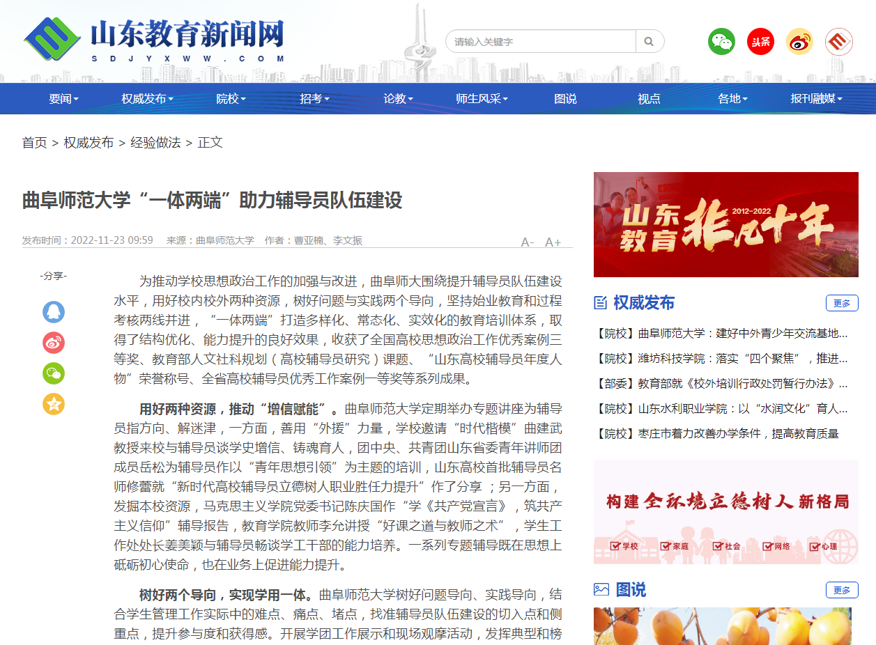 【山东教育新闻网】D体育在线登录官网“一体两端”助力辅导员队伍建设