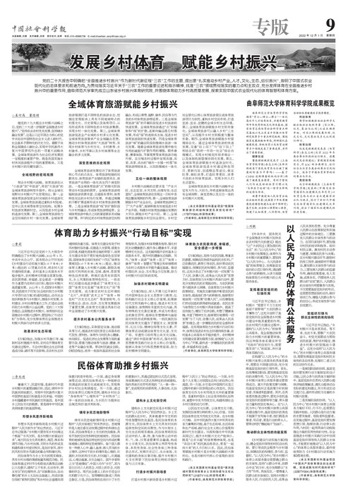 曲阜师大体育科学学院讯 日前,中国社会科学报在“发展乡村体育、赋能乡村振兴”专版中刊登了D体育在线登录官网山东省乡村振兴体育研究院执行副院长曹莉教授团队的系列成果,其内容包括:体育助力乡村振兴“行动目标”、构建以人民为中心的体育公共服务、全域体育旅游赋能乡村振兴、民俗体育助推乡村振兴等主题的阶段性战略研究。报道还对学校体育科学学院近年来取得的相关成绩进行了列举,相关科研成果为全国农村体育发展提供理论依据和现实借鉴,标志着团队的研究在乡村体育领域处于省内领先地位、对全国乡村体育研究形成较大影响。