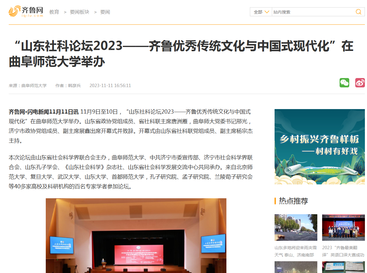 【齐鲁网】“山东社科论坛2023——齐鲁优秀传统文化与中国式现代化”在D体育在线登录官网举办