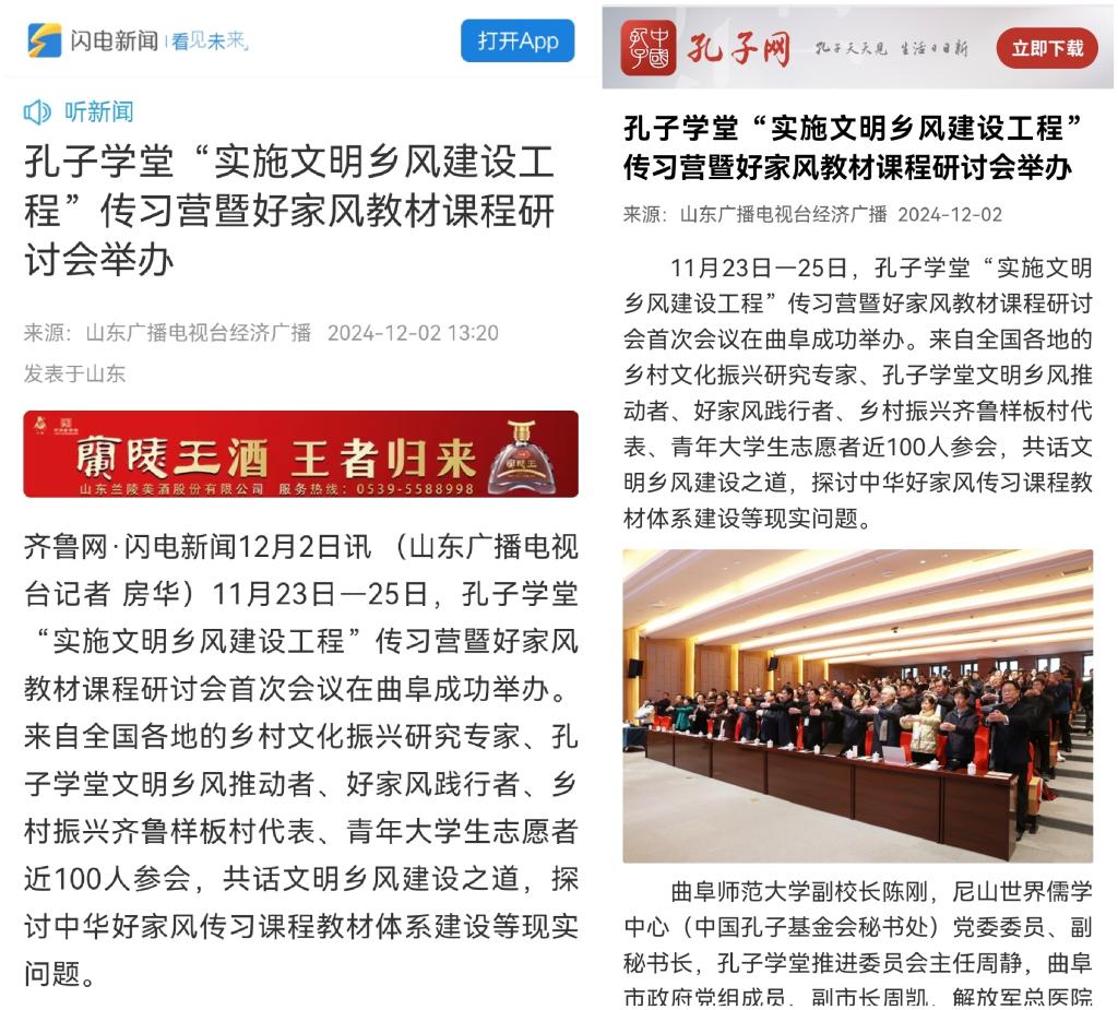 11月23日—25日,孔子学堂“实施文明乡风建设工程”传习营暨好家风教材课程研讨会首次会议在曲阜成功举办。来自全国各地的乡村文化振兴研究专家、孔子学堂文明乡风推动者、好家风践行者、乡村振兴齐鲁样板村代表、青年大学生志愿者近100人参会,共话文明乡风建设之道,探讨中华好家风传习课程教材体系建设等现实问题。