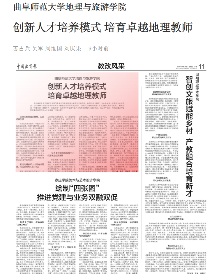 在制定培养目标时,学院大力弘扬教育家精神,将教育家精神融入地理教师专业发展全过程,筑牢从教信念之基。在创新培养方式方面,学院构建协同开放的融合模式,响应需求,强化实践,扎下从教立身之根。在培养过程中,学院创新促进发展的评价机制,推动地理师范生自我发展,夯实从教素养之本,以地理师范生从业能力为培养核心,将卓越地理教师素能培养贯穿整个培养过程。学院教师入选山东省高校黄大年式教师团队,地理教育教学团队拥有多名山东省课程思政教学名师、师德标兵,他们以教育家精神为引领,致力于培养具备高尚师德、教育情怀和家国情怀,拥有深厚文化底蕴和广阔国际视野的优秀中学地理教师。