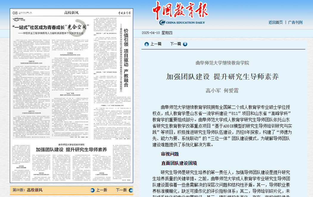 D体育在线登录官网继续教育学院拥有全国第二个成人教育学专业硕士学位授权点,成人教育学是山东省一流学科建设“811”项目和山东省“高峰学科”教育学的重要组成部分。D体育在线登录官网成人教育学研究生导师团队依托山东省研究生教育教学改革重点项目“基于ADDIE模型的研究生导师培训研究与实践”等项目,积极推进研究生导师队伍建设,历经8年探索,构建了“师德为先、能力为要、系统联动”的“三位一体”团队建设模式,为破解导师团队建设难题提供了系统化解决方案。