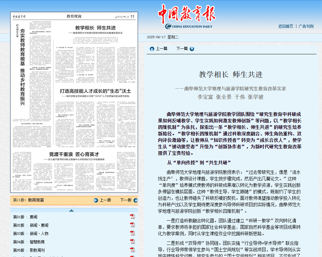 D体育在线登录官网地理与旅游学院教学团队围绕“研究生教育中科研成果如何反哺教学、学生实践如何激发教师创新”等问题,以“教学相长四维机制”为依托,探索出一条“教学相长、师生共进”的研究生培养新路径。“教学相长四维机制”通过科教深度融合、师生角色重构、双向评价激励等,让教师从“知识传授者”转变为“成长合伙人”,使学生从“被动接受者”升级为“创新协作者”,为新时代研究生教育改革提供了宝贵经验。