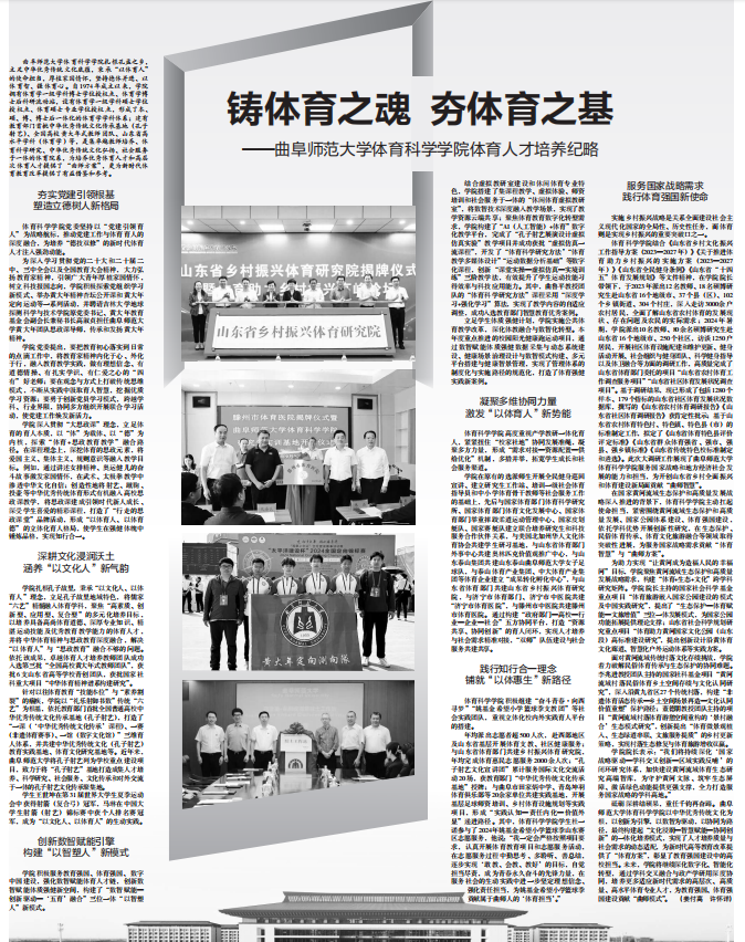学院扎根孔子故里,秉承“以文化人、以体育人”理念,立足孔子故里地域特色,将儒家“六艺”精髓融入体育学科,聚焦“高素质、创新型、应用型、复合型”的多元化培养目标,以培养具备高尚体育道德、深厚专业知识、精湛运动技能及优秀教育教学能力的体育人才,并将中华体育精神与思政教育深度融合,解决“以体育人”与“思政教育”融合不够的问题。依托该成果,卓越体育人才培养教师团队成功入选第三批“全国高校黄大年式教师团队”,获批6支山东省高等学校青创团队,获批国家社科重大项目“中华体育精神谱系构建研究”。