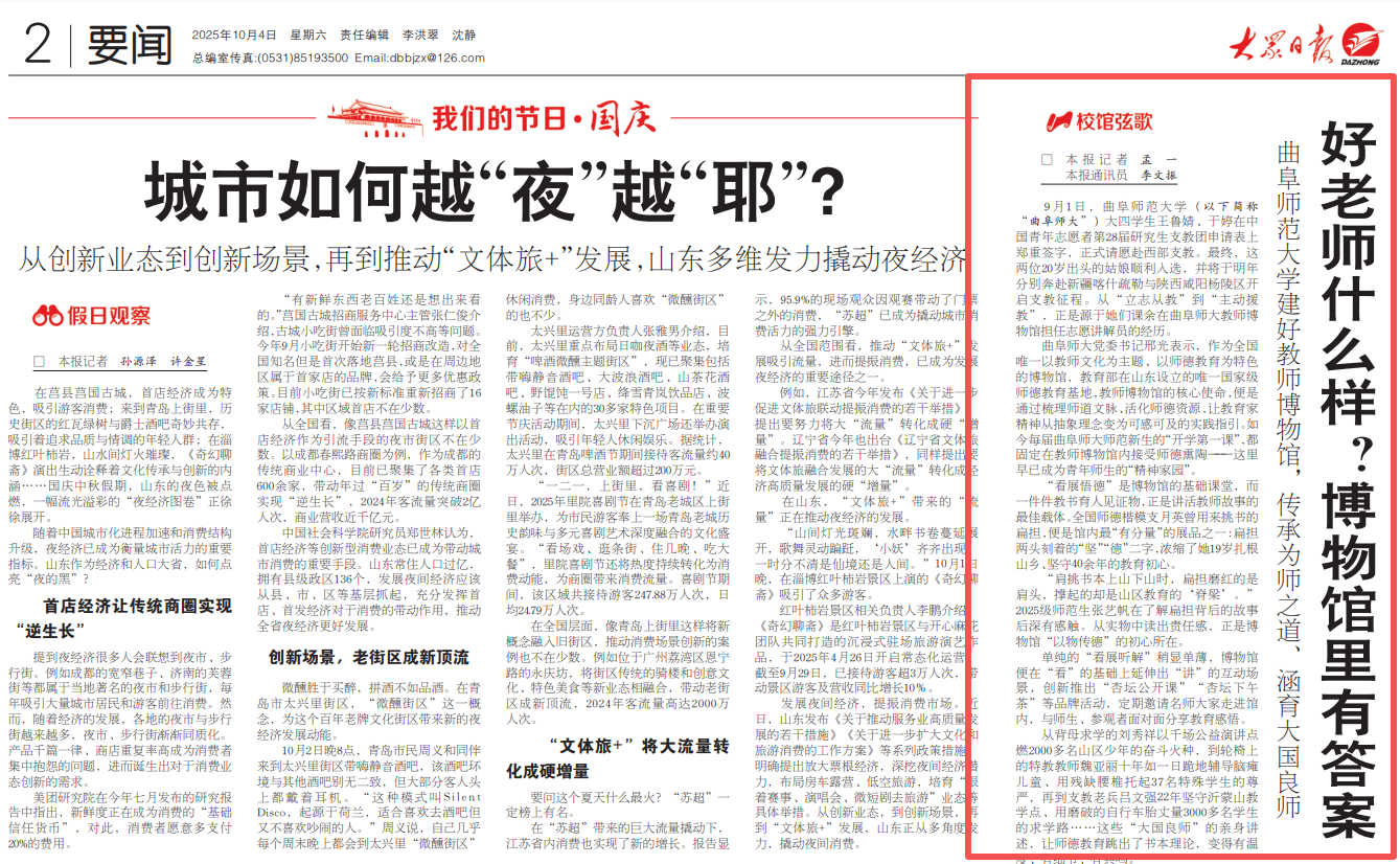 10月4日,《大众日报》刊发题为《好老师什么样?博物馆里有答案——D体育在线登录官网建好教师博物馆,传承为师之道、涵育大国良师》的报道,解读了学校建设教师博物馆,从看、讲、演、说四个维度创新师德教育、弘扬教育家精神的特色实践。