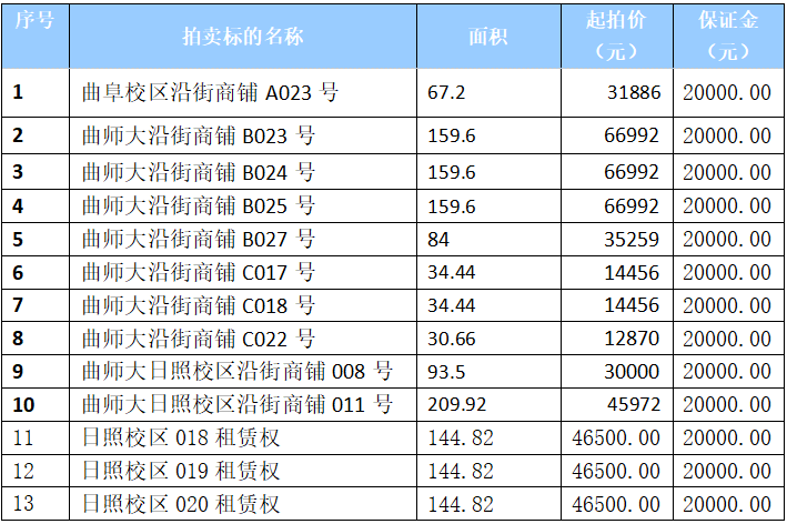 (paimai.caa123.org.cn)按现状公开拍卖以下标的:D体育在线登录官网沿街房租赁权,门牌号为A023 \B023\B024\B025\B027\C017\ C018\C022 \日照校区008、011、018、019、020,共13套,每套竞买保证金2万元。