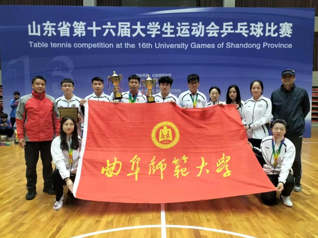 曲阜师大新闻中心讯   11月30日至12月5日,由山东省教育厅、山东省体育局主办,山东大学承办的山东省第十六届大学生运动会乒乓球比赛在青岛职业技术学院举行。本届比赛共设甲、乙、丙三个组别,来自全省各高校49支队伍600余人参加了各组比赛,赛事规模创造历史新高。经过6天紧张激烈的比赛,我校乒乓健儿取得甲组混合双打冠军、女子双打冠军两枚金牌,甲组团体总分第四名和丙组团体总分第六名的好成绩,并荣获体育道德风尚奖,取得体育竞技和精神文明的双丰收。
