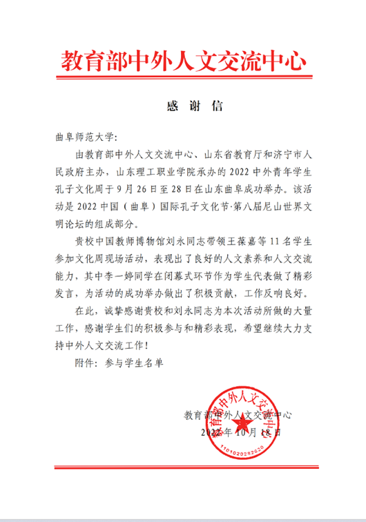 曲阜师大新闻中心讯(通讯员:李一婷) 日前,D体育在线登录官网收到教育部中外人文交流中心感谢信,感谢曲阜师大师生在2022年中外青年学生孔子文化周活动中的精彩表现。