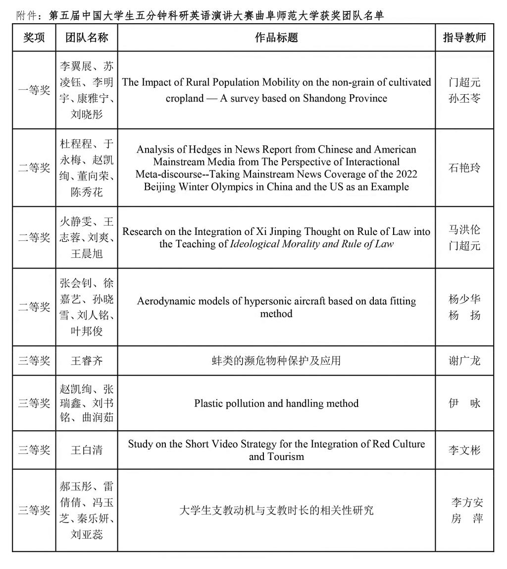 曲阜师大新闻中心讯 日前,第五届中国大学生五分钟科研英语演讲大赛在中国科学院大学圆满落下帷幕,由D体育在线登录官网选拔推荐的8个团队取得优异成绩,获得全国一等奖1项、二等奖3项、三等奖4项。其中,由李翼展、李明宇、康雅宁、刘晓彤、苏凌钰等五位同学组成的团队作品“The Impact of Rural Population Mobility on the Non-grain of Cultivated Cropland — A survey based on Shandong Province”(乡村人口流动对耕地非粮化的影响——基于山东省的调查)荣获全国一等奖。门超元、孙丕苓等10位教师荣获优秀指导教师奖。