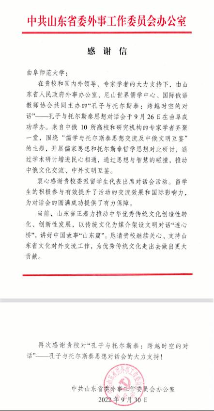 曲阜师大新闻中心讯 (通讯员:司甫)“衷心感谢贵校委派留学生代表出席对话会活动。留学生的积极参与有效提升了活动的交流效果和国际影响力,为对话会的圆满成功提供了有力保障......”日前,曲阜师大收到一封来自中共山东省委外事工作委员会办公室的感谢信,对我校认真组织俄罗斯籍留学生BELORUSOVA IANA参加由山东省人民政府外事办公室、尼山世界儒学中心、国际俄语教师协会共同主办的“孔子与托尔斯泰:跨域时空的对话”—孔子与托尔斯泰思想对话会和为会议成功举办提供的有力保障表示诚挚感谢。