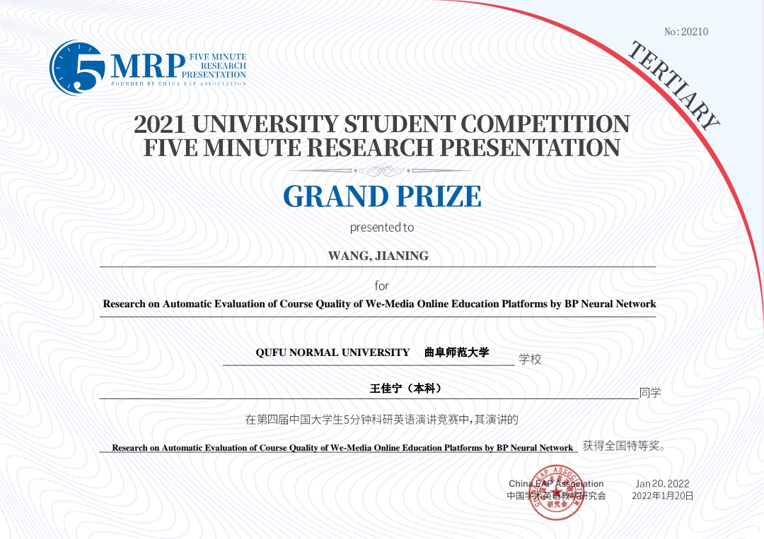 曲阜师大新闻中心讯(通讯员:丁元吉)日前,第四届中国大学生5分钟科研(工科农科文科类)英语演讲大赛决赛在清华大学落下帷幕,由曲阜师大公共外语教学部组织、遴选、推荐的王佳宁同学斩获特等奖。此次比赛,王佳宁同学由公共外语教学部杜庆凤老师(语言指导)和传媒学院郭顺利老师(专业指导)共同指导。
