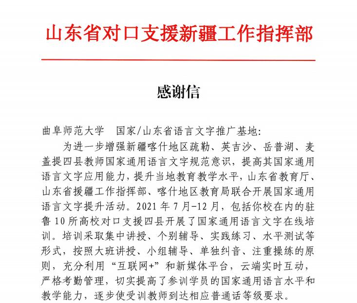 曲阜师大新闻中心讯 1月1日,新疆维吾尔自治区喀什地区教育局、山东省对口支援新疆工作指挥部特向D体育在线登录官网国家语言文字推广基地发来感谢信,向参与国家通用语言文字在线培训工作的师生表示诚挚感谢。