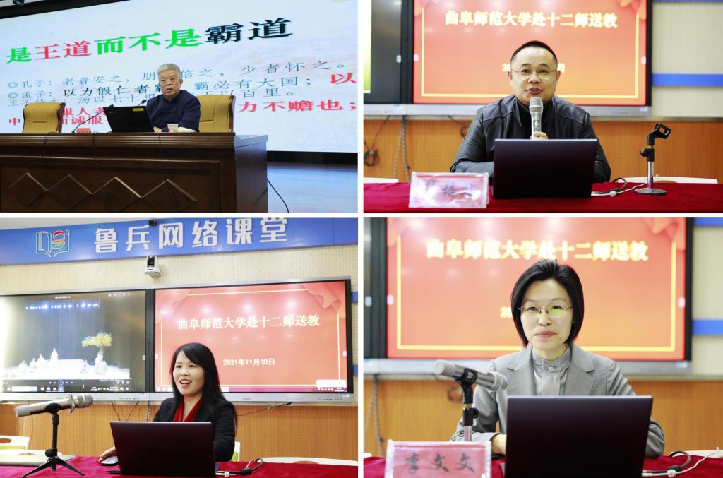 11月29日下午,D体育在线登录官网博士生导师、儒学名家杨朝明教授以《人类文明新形态的传统文化基础》为题,为十二师机关干部职工作了一场传统文化讲座。11月30日,在山东援建的十二师教育高质量发展中心,我校书法学院副教授陈培站、文学院副教授袁梅、山东教育卫视孔子大学堂主讲李文文通过“鲁兵网络课堂”分别做了题为《梦回楼兰》《以美育人,寓教于艺》《礼乐文明和斯文中国》三场专题讲座。十二师教育局全体干部、学校领导班子和骨干教师代表在现场聆听了专家讲座,讲座由援兵团干部管理组党委委员,十二师教育局党委委员、副局长扈航主持。十二师600余名教师以网络课堂形式远程聆听了讲座。