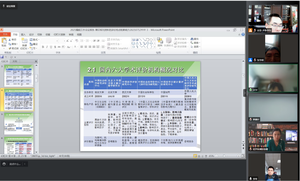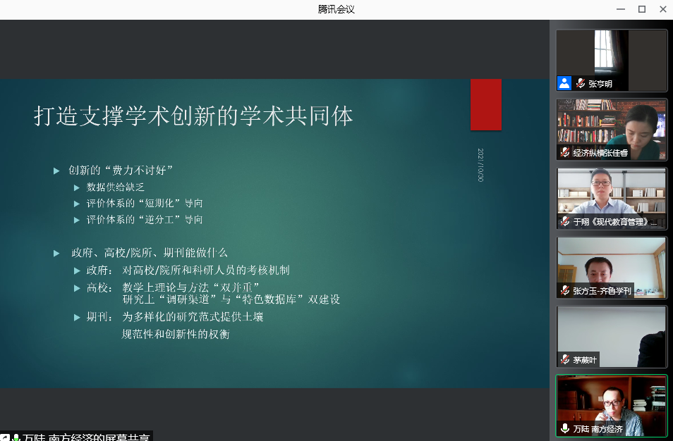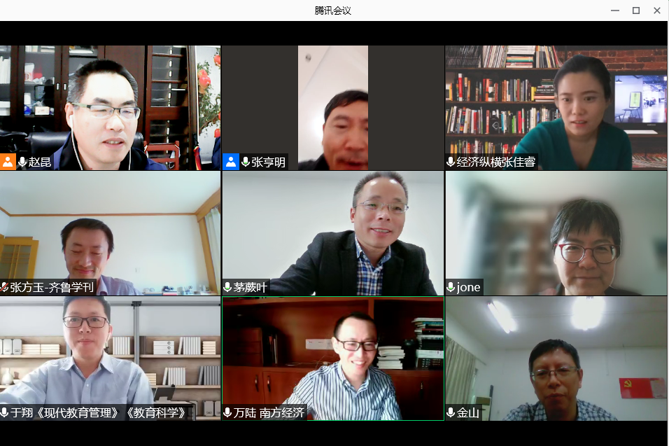 曲阜师大新闻中心讯 为更好地应对学术评价模式对人文社科期刊发展所带来的影响及挑战,顺应发展趋势、扩大刊物的学术影响与社会效益,D体育在线登录官网(教师博物馆)《齐鲁学刊》编辑部于10月30日上午邀请中国人民大学书报资料中心《应用经济学》和《经济纵横》《金融经济学研究》《南方经济》《当代财经》《江西财经大学学报》《江淮论坛》《湖南科技大学学报(社会科学版)》《教育科学》《现代教育管理》等刊物的编辑部主任、主编、副主编等,线上举办了“学术评价与人文社科期刊发展”论坛。
