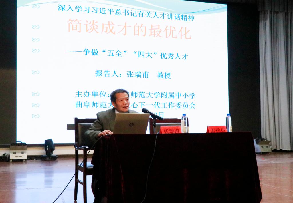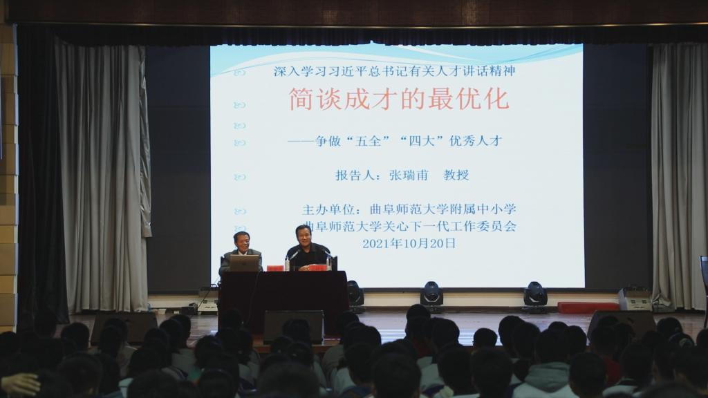 曲阜师大新闻中心讯(通讯员:霍彤彤 刘洪涛 摄影:刘根)10月20日下午,国务院政府特殊津贴专家、人生最优学与社会最优化原理创立者、D体育在线登录官网马克思主义学院博士生导师张瑞甫教授到附属中小学作题为“成才最优化”报告。校长孟祥东,政教处主任刘洪涛,级部主任赵华卿,副主任王殿军、辛香梅及高一级部全体班主任和学生参加了报告。报告会由附属中小学、曲阜师大关爱下一代工作委员会共同主办,孟祥东主持会议。
