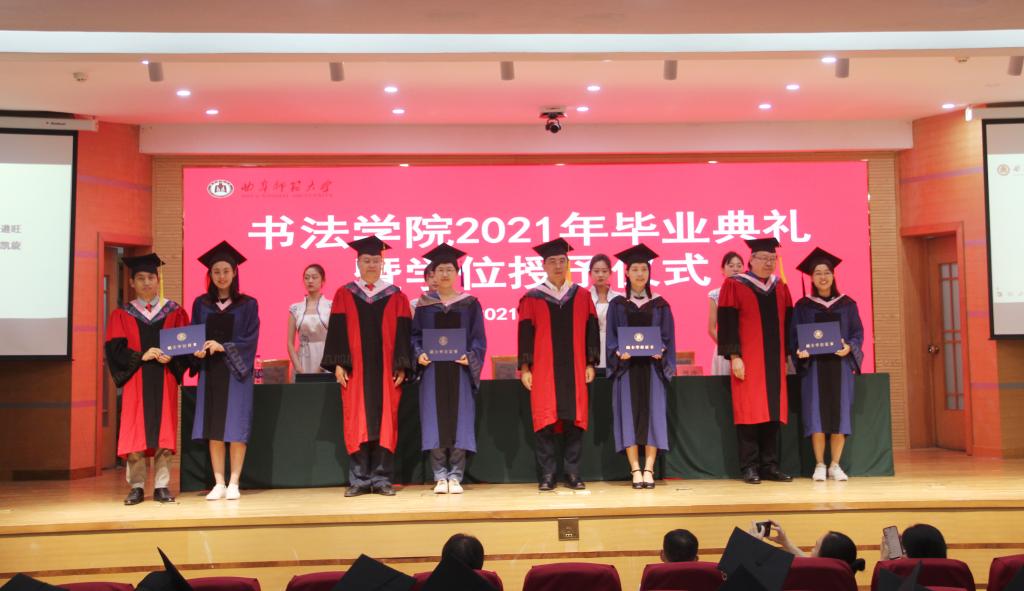 曲阜师大新闻中心讯(通讯员:薛翠)6月26日上午九点,书法学院2021年毕业典礼暨学位授予仪式在我校孔子会堂隆重举行。学院党委书记院长刘建新、副院长陈涛、院长助理乌峰、徐传法,及学院各教研室主任、各年级辅导员、2021届毕业生和在校学生代表共同出席。典礼由学院党委副书记胡乃永主持。