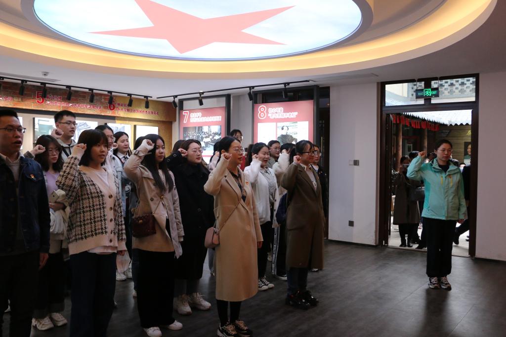 在纪念馆里,全体党员在展柜前驻足良久,观看了图片资料和珍贵历史文物,聆听感人事迹,唤起红色记忆,切身感受了革命先烈们浴血奋战、可歌可泣的峥嵘岁月和坚如磐石的共产主义信仰。全体党员在党旗前重温入党誓词,缅怀革命英雄,铭记初心使命。
