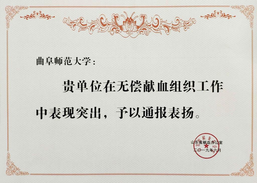 近日,山东省献血办公室下发无偿献血表现突出集体及个人表扬的通报,我校因无偿献血组织工作表现突出受到通报表扬,张林等14名同学受到表扬。