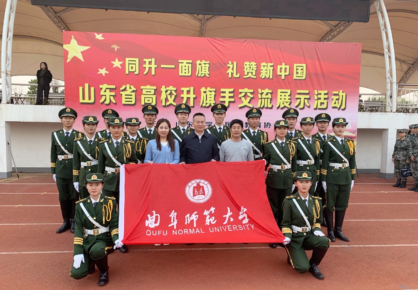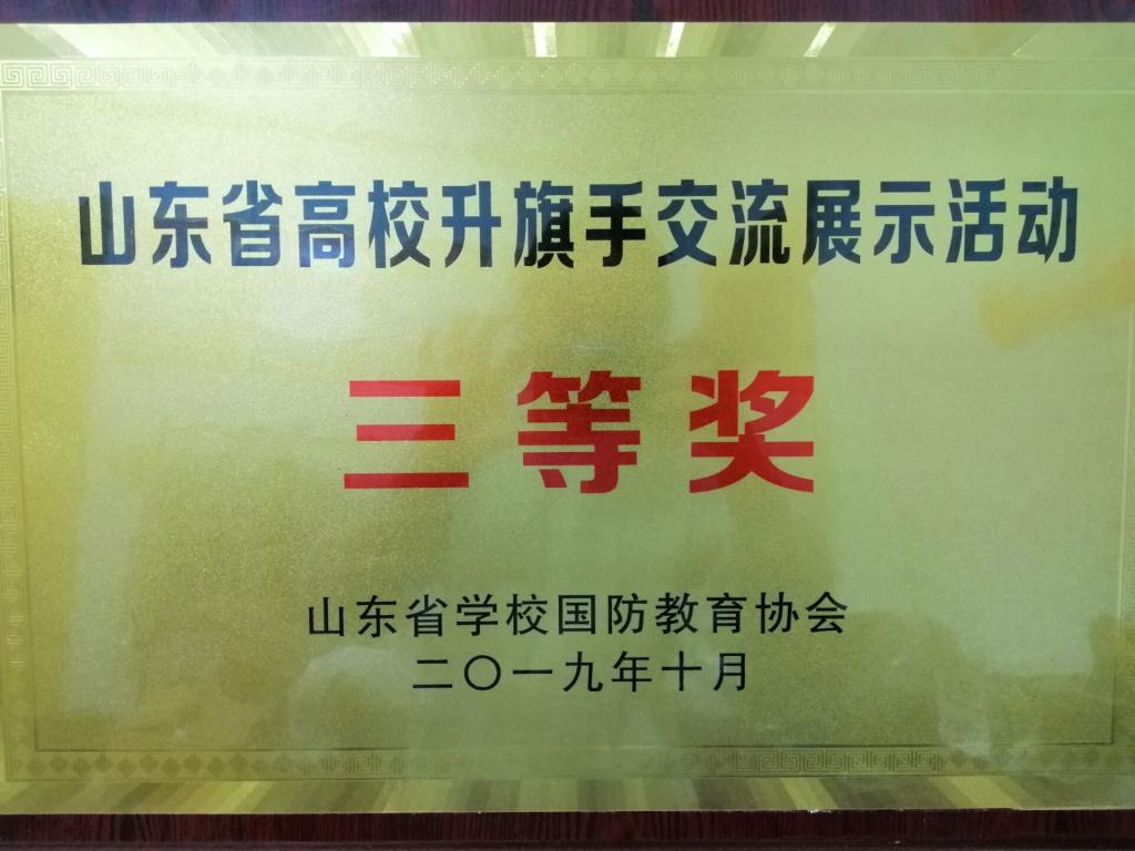 为庆祝中华人民共和国成立70周年,培育高校大学生的国旗意识和国防观念,丰富国防教育内容,我校武装部副部长赵秀臣、学生工作处柳絮老师带领16名学生参加了 “同升一面旗、礼赞新中国”山东省高校升旗手交流展示活动,并荣获集体三等奖的佳绩,高赟岳同学获得“优秀升旗手”荣誉称号。