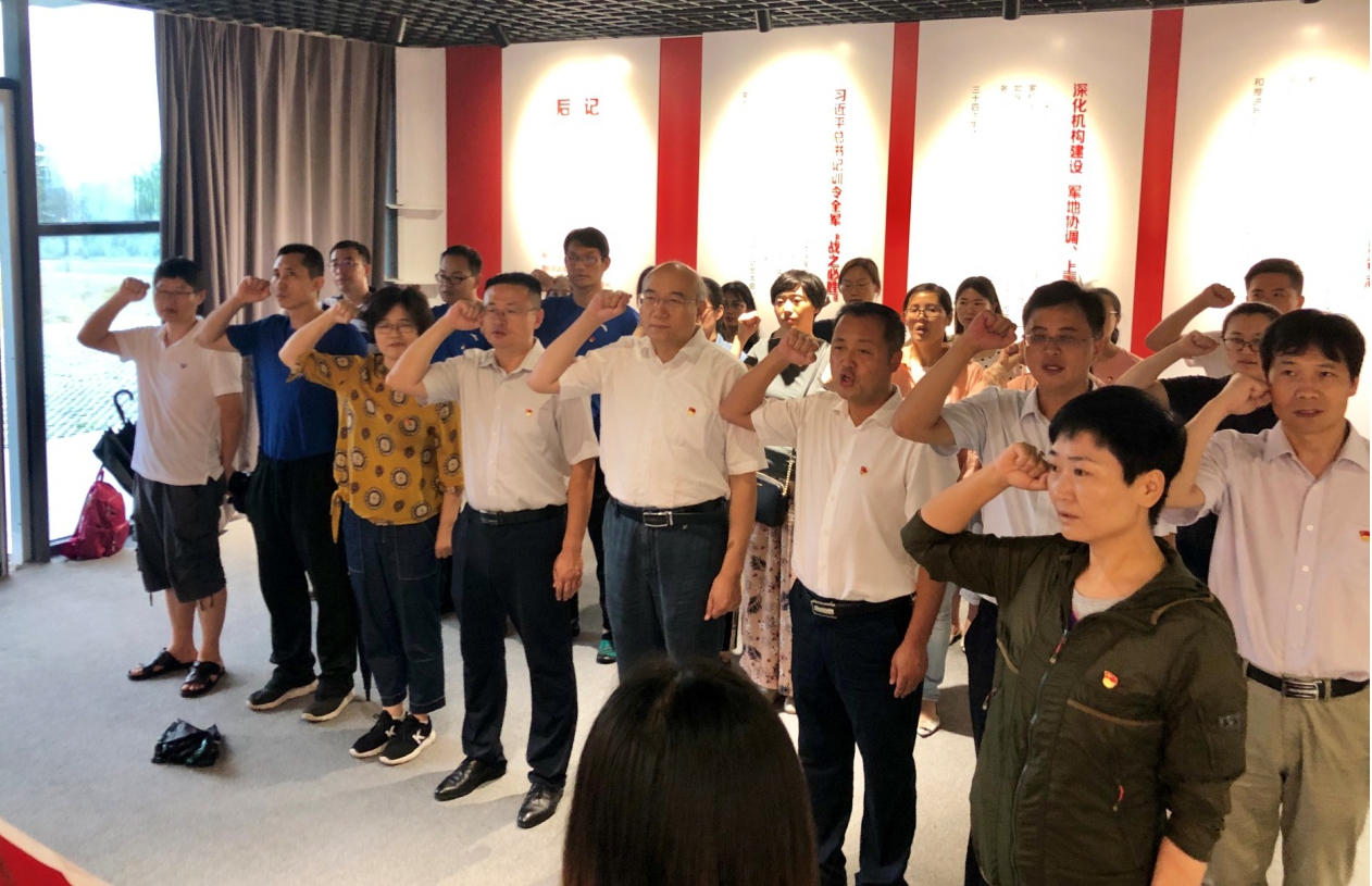 绵绵阴雨和隆隆雷声挡不住全体党员同志的学习热情。第一站首先来到驻龙山中华国防教育展馆。在展馆内,全体党员仔细观看、认真聆听,深入了解了我国“弱国之殇有国无防”、“创建人民军队”等 5个阶段的国防历史,体会到了革命先辈为建设强大国防所作出的伟大贡献,进一步认识到新时代强大国防的来之不易。一件件实物,一张张展板,呈现在一颗颗跳动的心前,党员们深受震撼。最后来到历代领导人像前,全体党员面对党旗重温入党誓词。坚定洪亮的声音,不仅仅是全体党员内心深处的真实呼喊,更是对全体党员入党初心的再次警示,告诫党员同志们要“不忘初心、牢记使命”,做一名合格党员,做优秀党员。