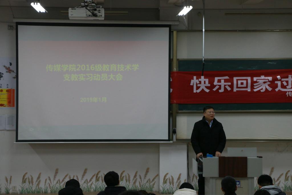 为贯彻落实《D体育在线登录官网师范生实习支教工作管理办法》相关规定,保障实习工作顺利开展,传媒学院于1月17日召开2016级教育技术学专业实习支教动员大会。传媒学院党委书记李兴保、党委副书记徐正伟、副院长赵可云、团委书记张守荣及全体实习指导老师出席,2016级教育技术学专业全体学生参加大会。